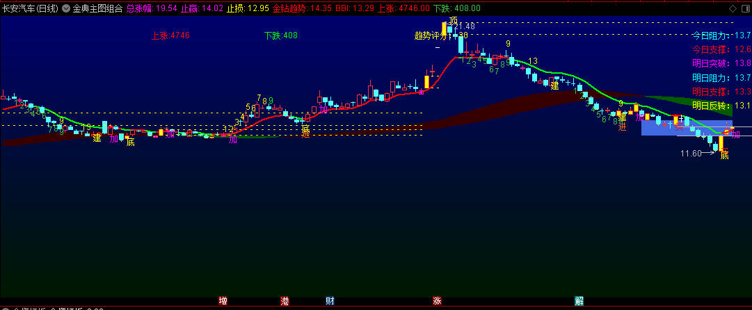 成本中枢:COST(50),COLORMAGENTA,LINETHICK2;(指标解析:绿色⑨=逃顶信号,红色⑨=抄底时机,紫线=主力平均成本)14