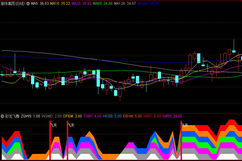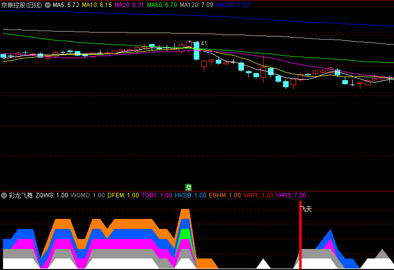 以均线原理编写,随着均线的变化以七色龙的形式展现,当出现红柱时,是起涨强势飞天的信号。