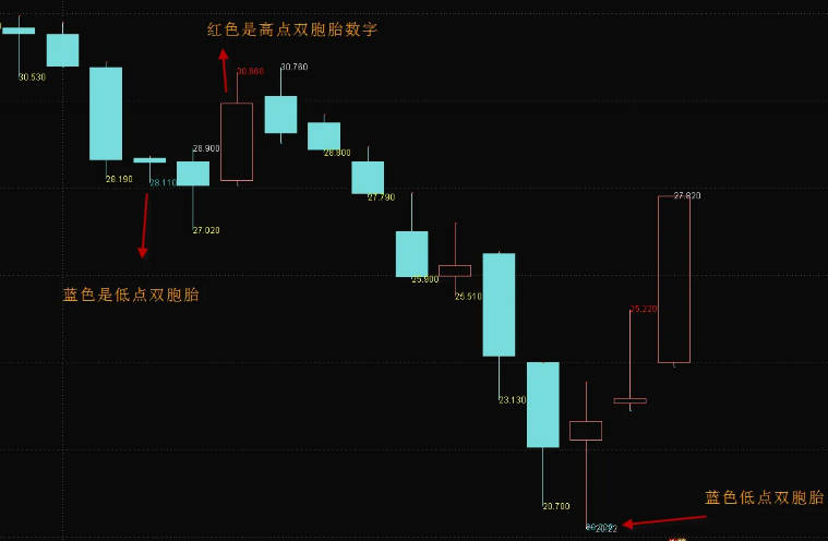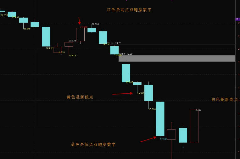 很快股市要开市了,今天给大家一个新年的礼物,指标是关于数字玄学的,使用上面,出现白色的数字表示有新高,出现黄色的数字代表有新低,数字是新高和新低的数值,然后更进一步,如果高点的数字的后两位是相同的,那么显示为红色数字,如果低点的数字的后两位是相同的,那么显示为蓝色数字。红色和蓝色的数字就叫做双胞胎数字。双胞胎数字有一定的概率表示趋势的转折,这里就把这些数字信息用主图的方式表达了出来供大家操盘参考了。希望大家喜欢,祝大家新的一年身体健康,万事如意!账户长虹!