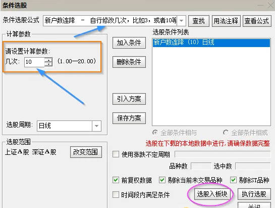 1、自己新建一个自定义板块,例如命名为:户数连降10次。