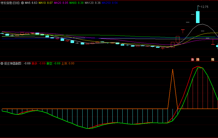 可结合均线等其它指标改变策略。下图是运用指标公式{捉庄神器}选股示例: