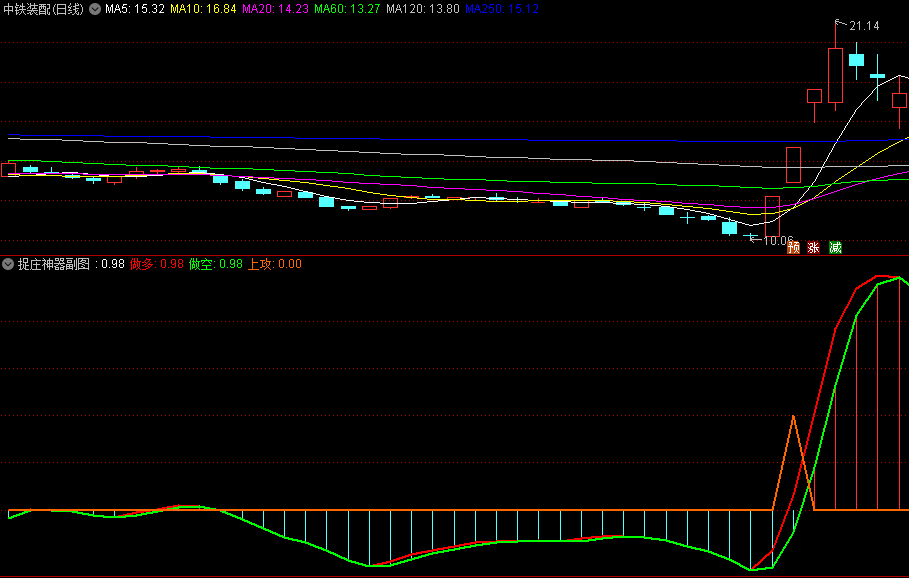如果红色线以45度角上行应当及时介入,当多空线合在一起变为绿色时,应当空仓规避风险。