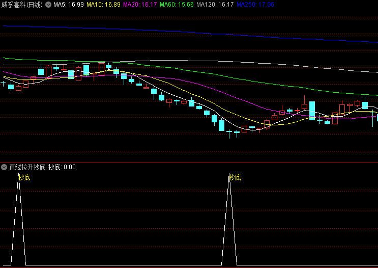 针对前期大幅回调,某天突然快速回拉这种状态的票写了一个“直线拉升抄底”指标,希望大家喜欢!!!