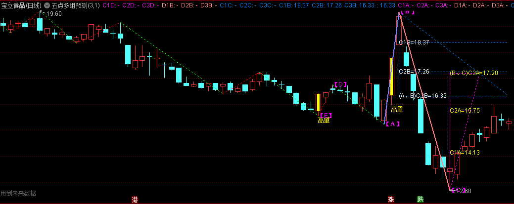 本指标是在一位爱好预测的坛友提供的“两点新版”的预测指标上修改、优化而编制出来的。本指标是微调自动预测的升级版,其预测与我以前编制的“微调自动预测”的基本架构是一样的,算法与预测赢家是相同的。特点是高、低选点不止是两点、三点,而是五点两种形态,通过微调周期和各点相互组合生成九组(最多)的空间预测。扩展了短周期的自动预测,有利于用一系列的预测分析股价的移动趋势,有利于判断买卖点,局部代替手动选点划线;还有一个功能是显示预测赢家的双三买入原则的三个价位,增加买入的确定性。