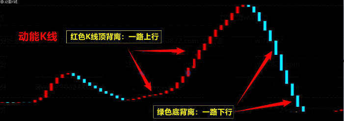 1、底背离:绿色动能k线,价格一路下行,动能K线杀跌动能减弱,不创出前期低点,与价格形成不同步;