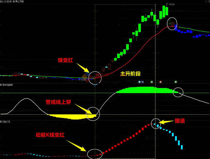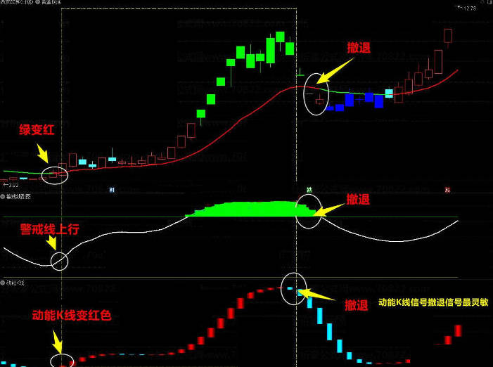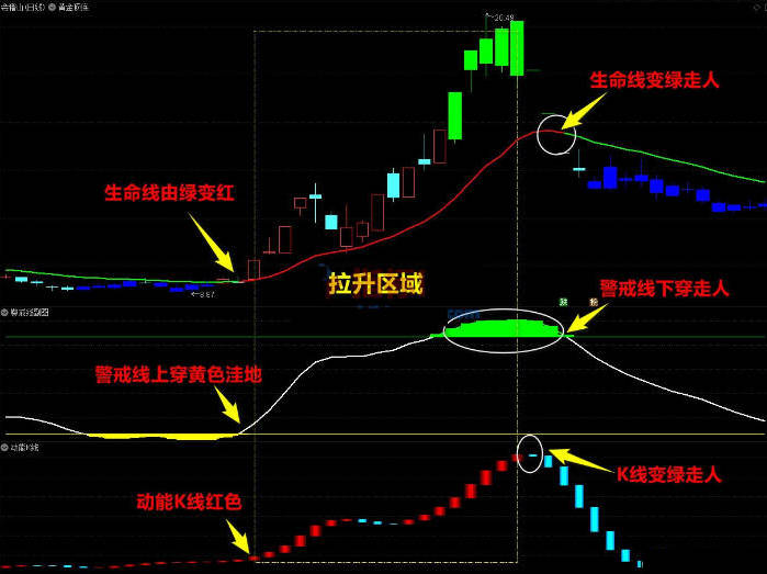 2.卖点(离场点)生命线绿色+股价击穿生命线收阴+警戒线绿色风险区+动能K线绿色。