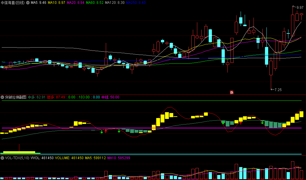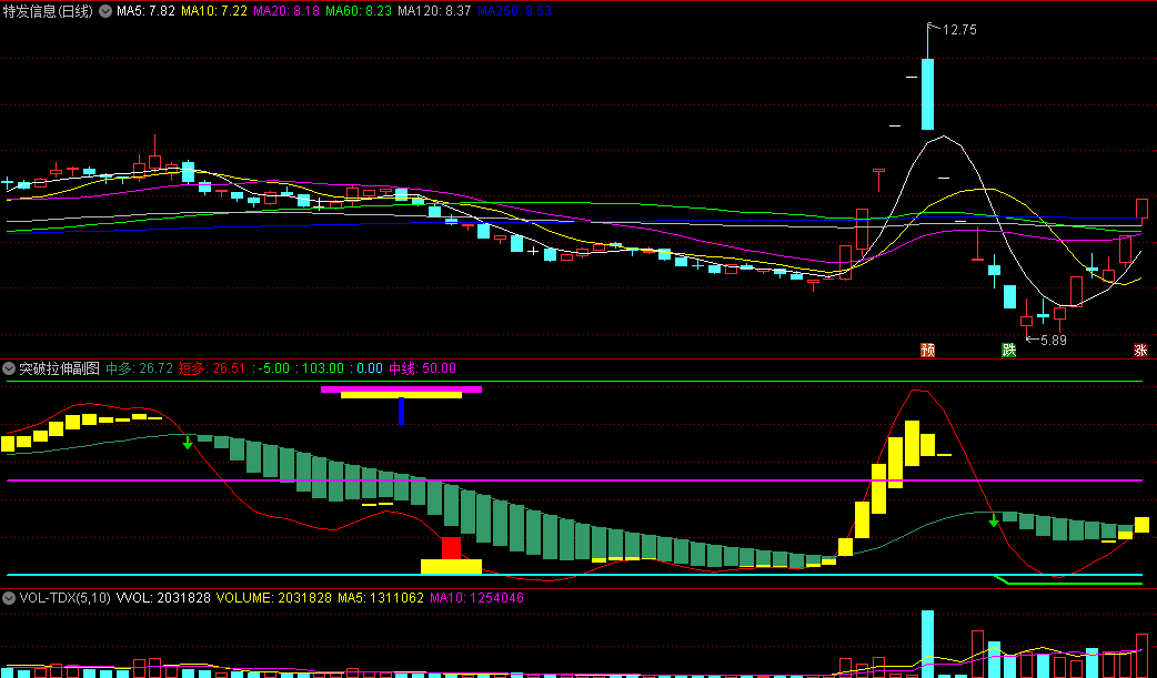红线上穿青色色带,出现黄色柱体,就有一波拉伸,无未来。
