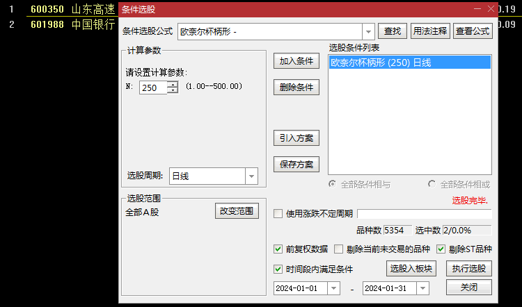 欧奈尔杯柄形态选股公式-最完善,自己编写用来选股的,选股数量很少,不喜勿下。不含未来函数。