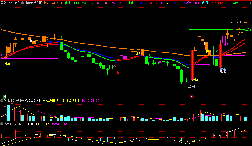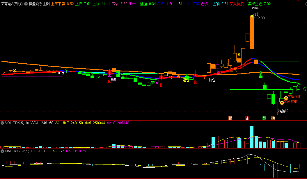 1、主图买点信号:加仓、建仓、B点、推进、启动、涨升、出击、金叉、火箭发射、低吸、红柱、紫X、上升。