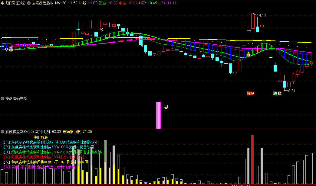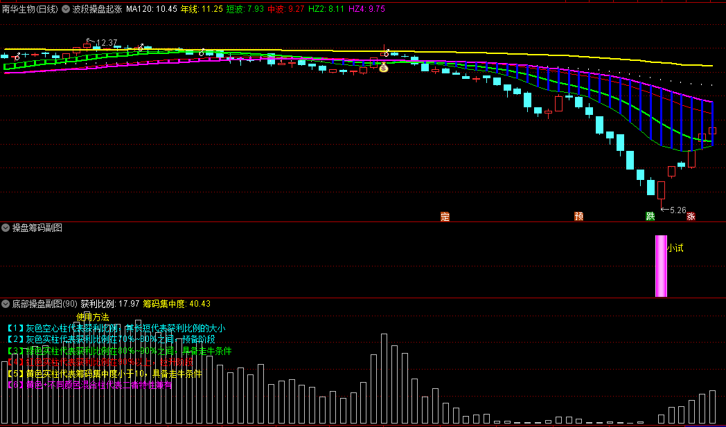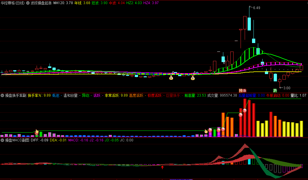 一个波段套装指标,包含了波段操盘起涨点主图、底部操盘副图、操盘筹码副图、操盘MACD副图、操盘换手率副图,一个主图和三个副图,