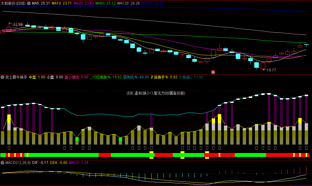 1.0轴上日换手:绿.地量<1/棕.冷清1<2/淡灰.温和2<3/黄.交投渐活3<5/红.活跃5<7/洋红.带量7<10/淡红.放量10<15/青.巨量15<25/蓝.异常>=25。