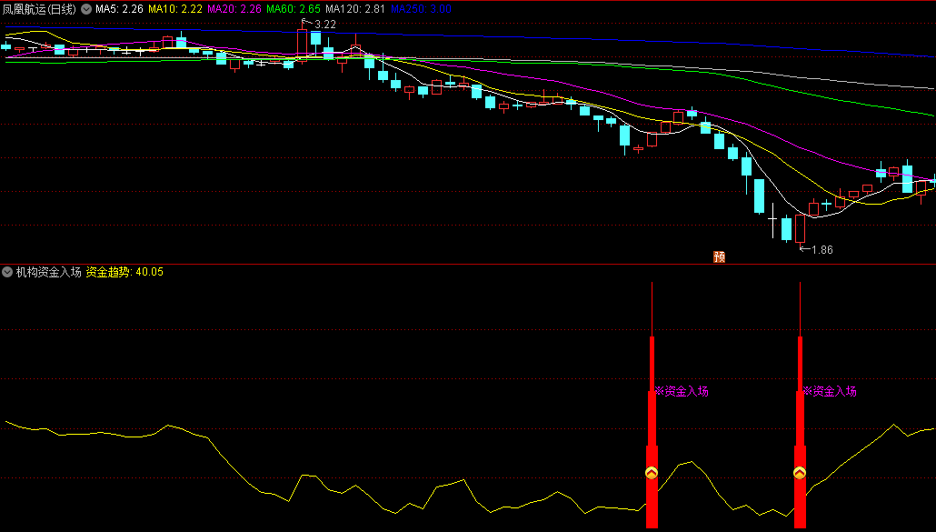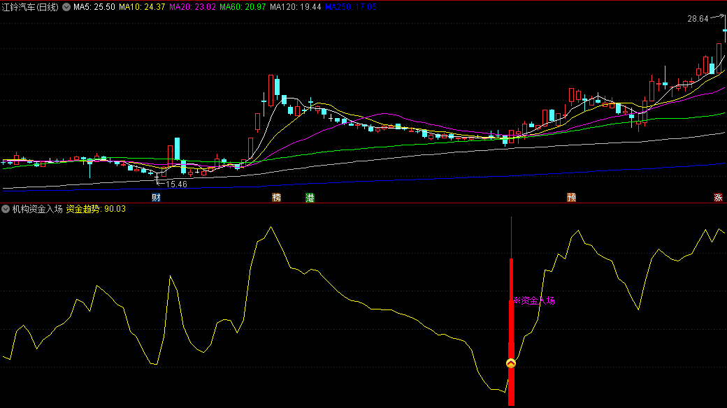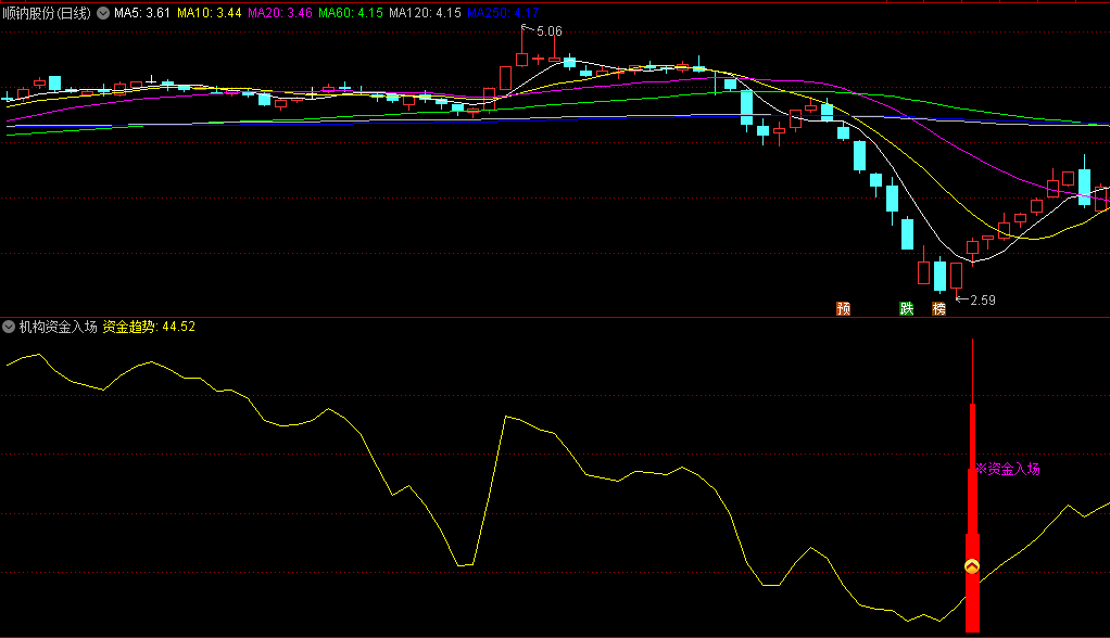 1.通达信机构资金入场副图指标,包含一个信号,信号数量适中,运用指数移动平均线和34日,60日的最低最高价之间的逻辑关系,推演出主力资金的一个趋势线量能,进而能够较精确的预警主力资金达到底部的一个点,以及主力机构资金重新介入的点;