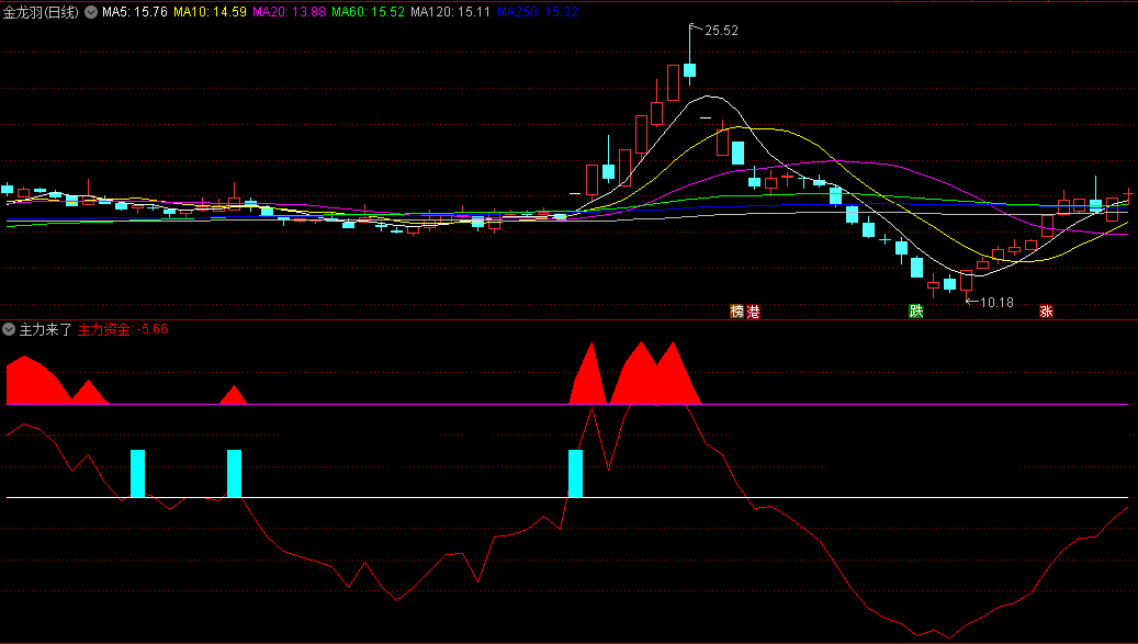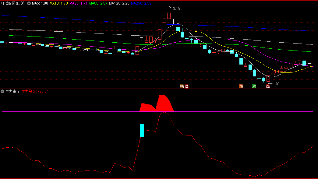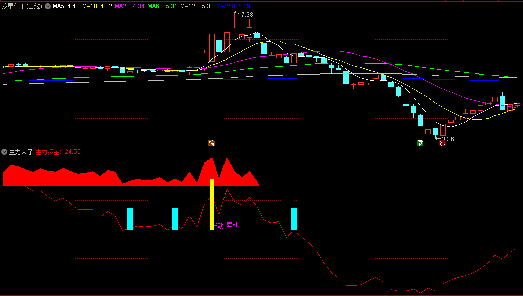 指标说明:一款主力异动指标公式,当青色信号柱出现时可重点关注,随后出现黄色异动信号时,结合其它技术指标适时介入。