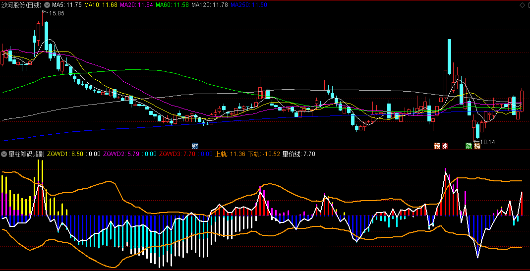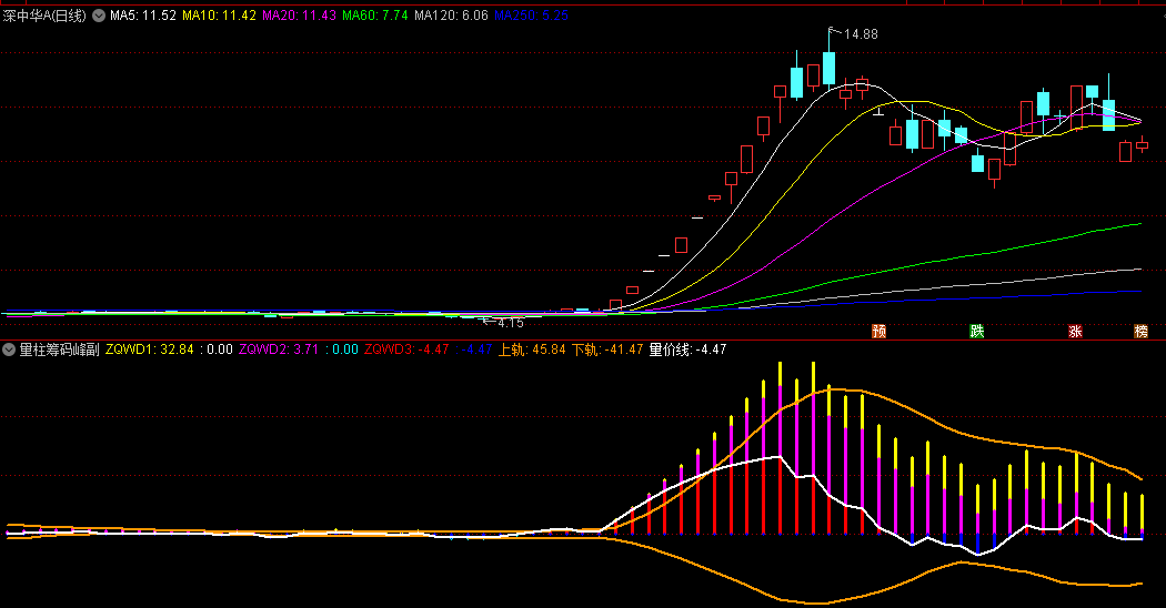 量柱筹码峰,这是一个量柱+筹码的指标公式,里面包含的信息很多。
