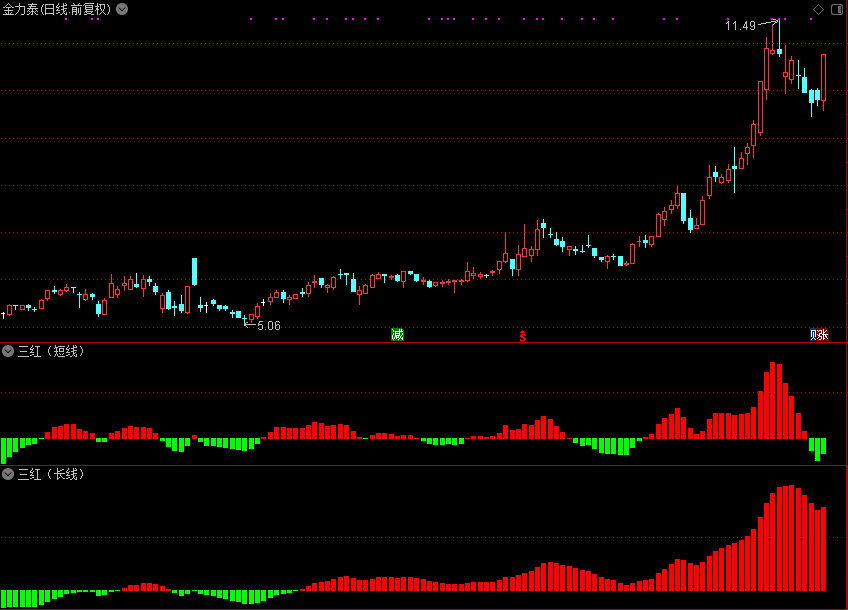 绿柱消失买入:STICKLINE(XA_1<0,0,XA_1,2.5,0),COLORGREEN;