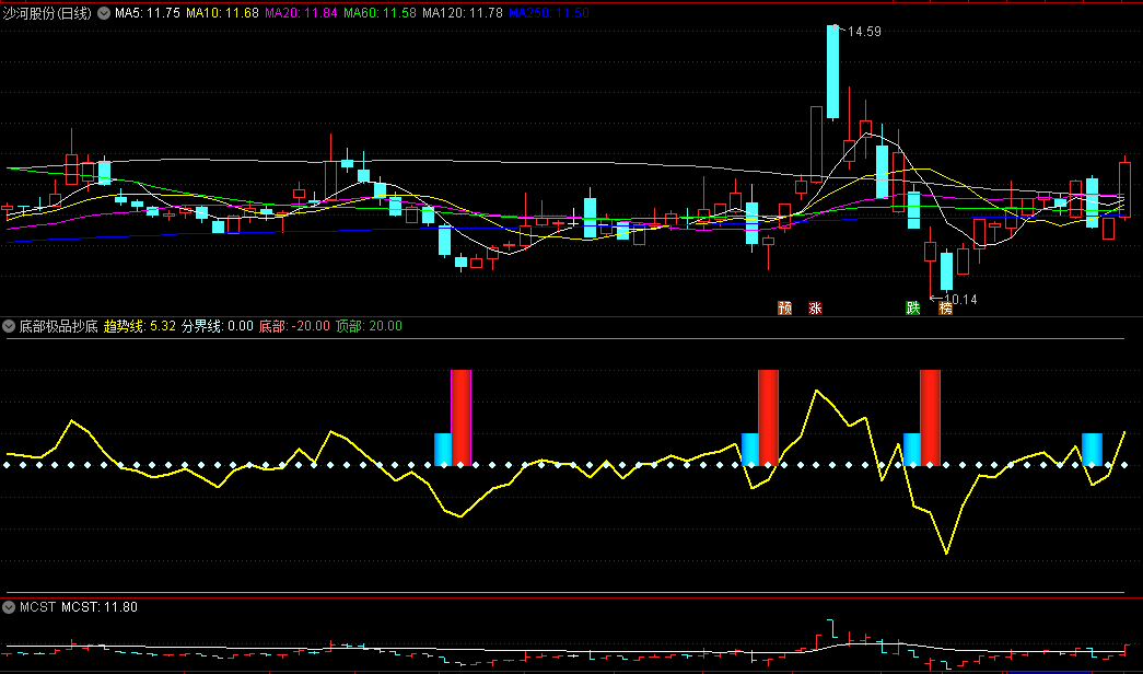 底部极品抄底——一个绝对的极品抄底指标公式,只要趋势线下行打穿底部线后然后拐头向上,这个拐点既是标准的底部区域可以大胆分批介入。