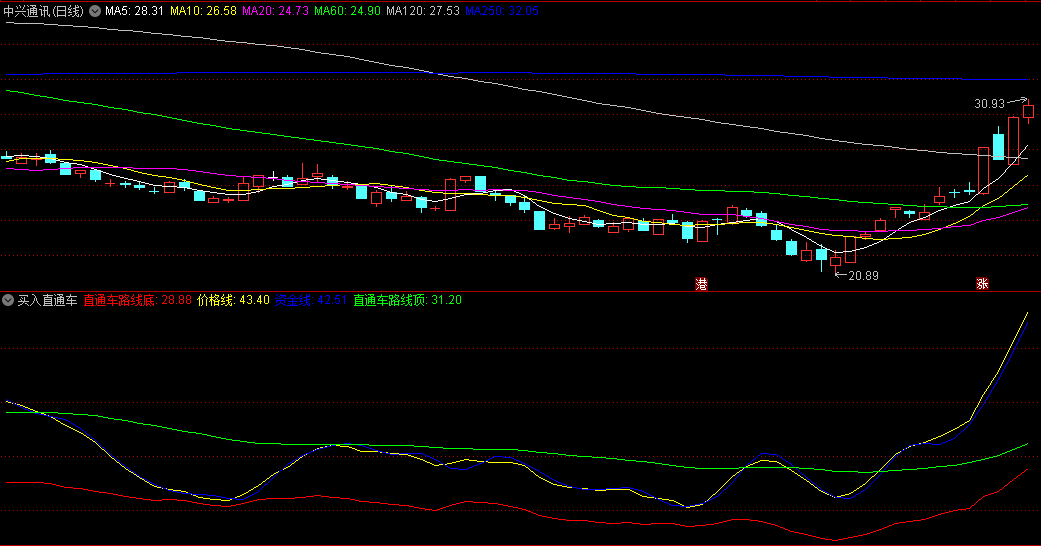 总共四条线,直通车路线底、价格线、资金线、直通车路线顶,当这四条线一起上扬的时候,就是进场机会!!!