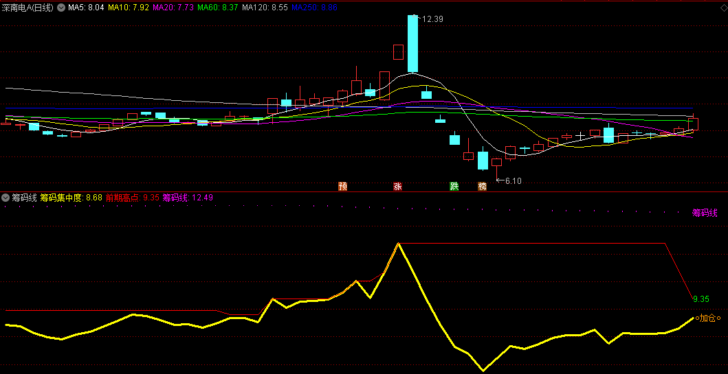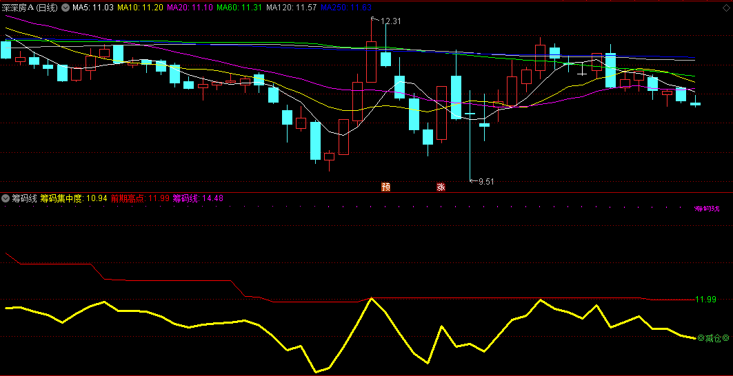 筹码线(源码、副图、通达信),给出三种判断,分别是:持股、加仓、减仓。