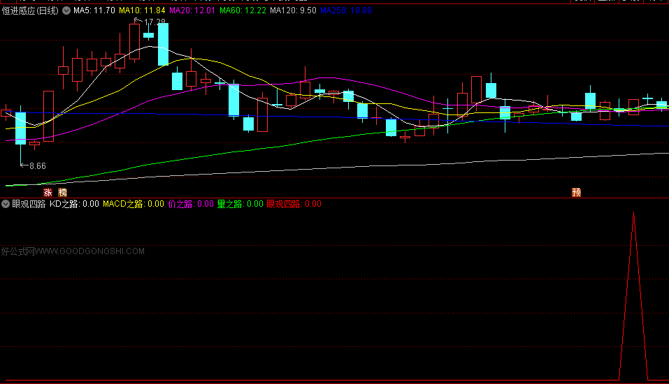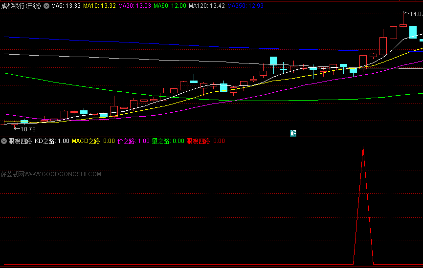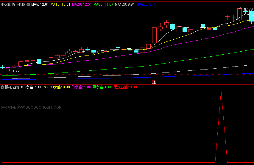 今天给大家分享的指标名为“眼观四路”副图指标,包含选股指标,指标不含未来函数。当股价长期下跌后开始企稳筑底,而后股价缓缓上升。有时会同时出现5日和10日均价线黄金交叉;5日和10日均量线黄金交叉;MACD黄金交叉;KDJ黄金交叉,这是股价见底回升的信号。有时会伴随出现两阳夹一阴多方炮、出水芙蓉、量顶天立地和MACD上穿零线等形态。一旦出现眼观四路买点信号,不论是大盘还是个股,都会有一波行情,准确率达到90%--95%。正确的买点必须满足如下条件:中长线欲买进的目标个股必须具备日K线、周K线形态健康,这是买进操作的前提。条件不符必须耐心、静心等待。