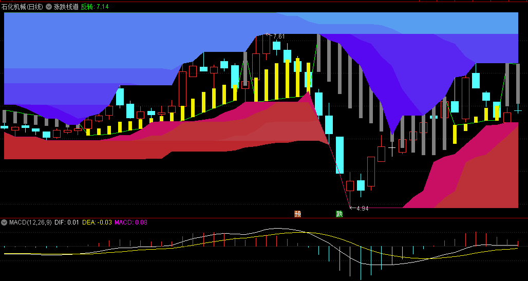 K线上面蓝色山峰是压力,这个山峰压制K线越低,反弹的概率越高;反之则下跌风险较高。