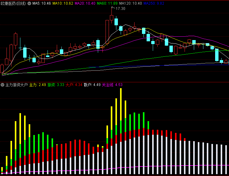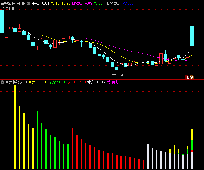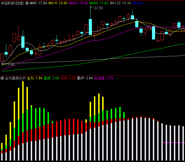 指标由游资、主力、大户、散户、警戒线组成。博弈资金主要用于分析成交量成分;当主力部分达到关注线的时候,说明该股具备了上涨的动能,但是注意不能用做决策的指标利用。