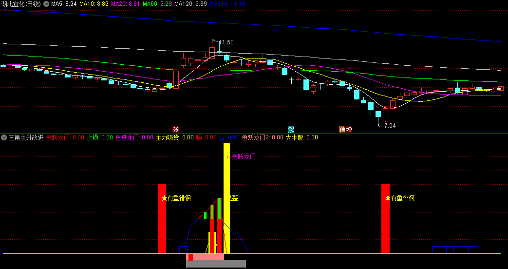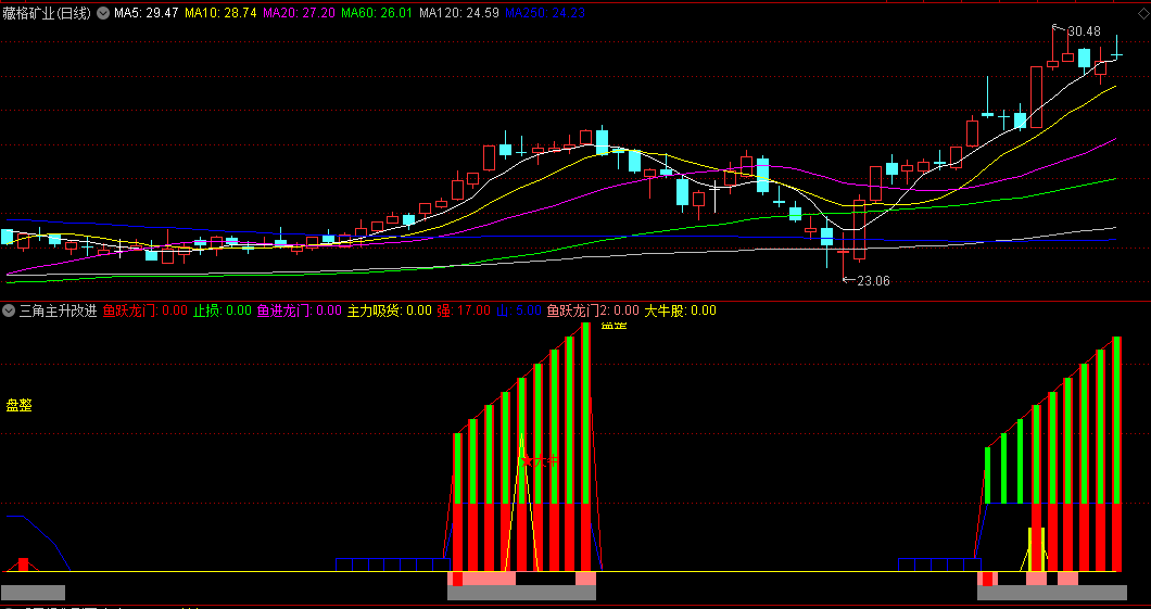 对三角主升指标进行了优化,做成改进版副图,源码。