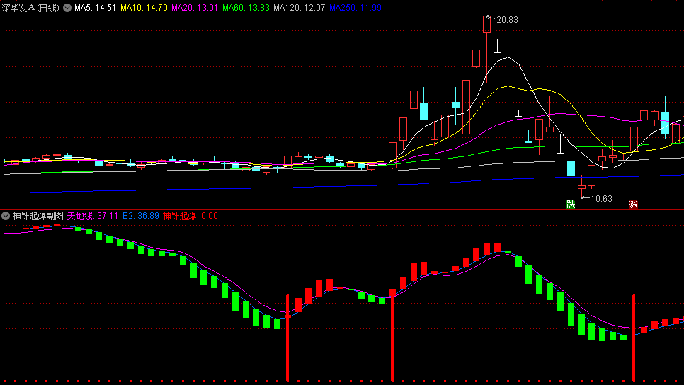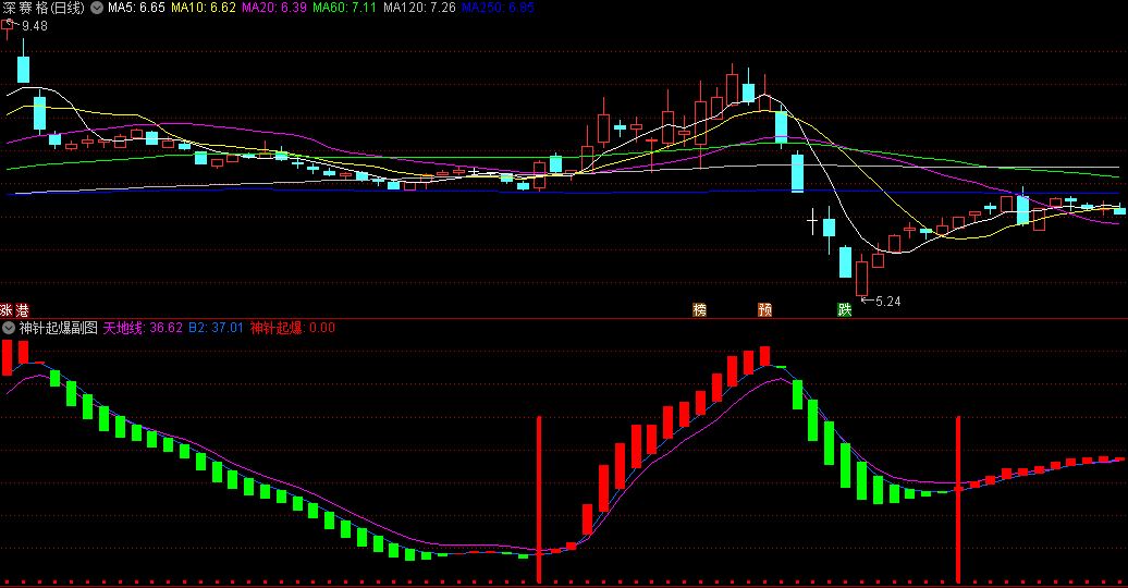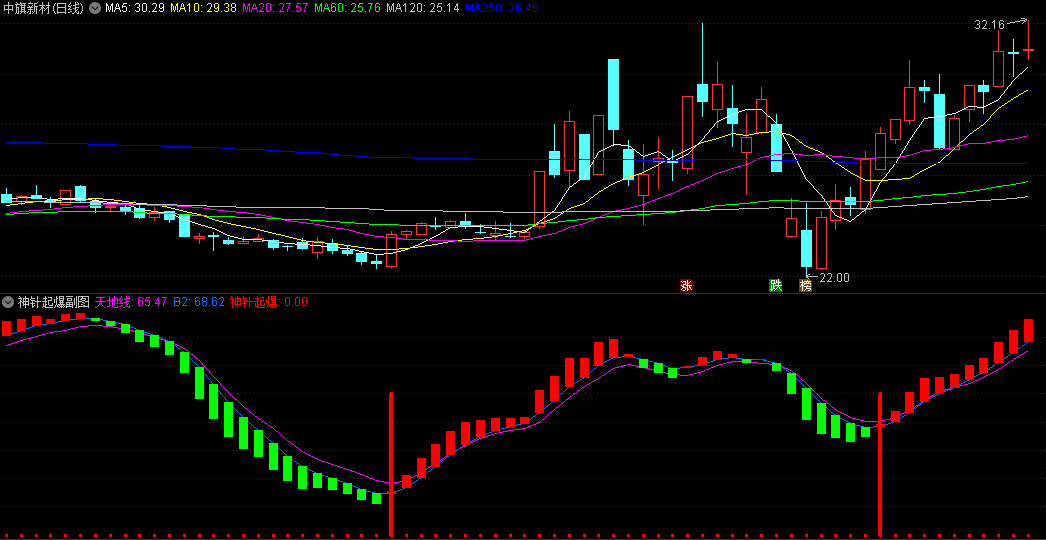 〖神针起爆〗副图/选股指标 出现红色金针后 蓝线上穿紫线 无未来 通达信 源码