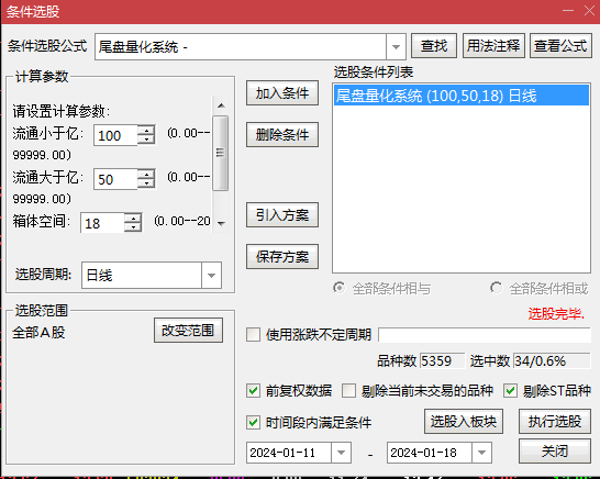 自动剔除问题个股(ST,*ST等有退市风险的个股),筛选个股流通盘大于50亿小于100亿(流通盘不大不小,刚好适中,方便主力资金运作);