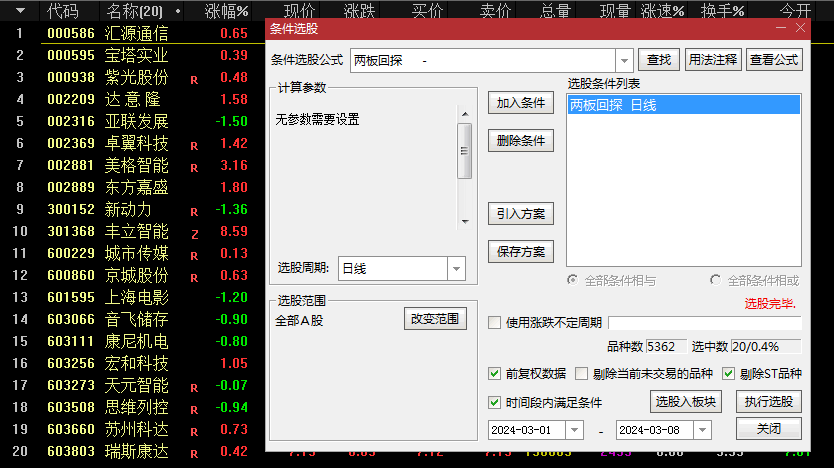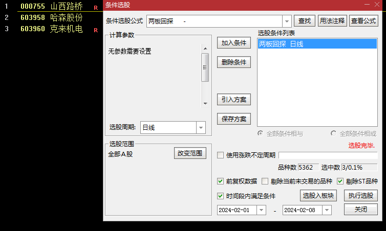 1、这个指标的选取标准是在股票连续两日涨停后,寻找那些出现回调的股票,并在适当的时机买入,预期在主力的再次拉升中获利。
