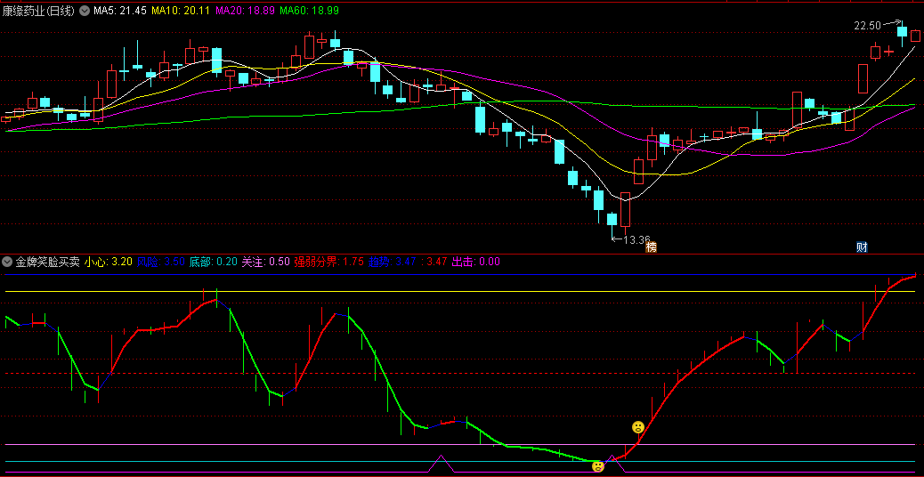 〖金牌笑脸买卖〗副图指标 强劲趋势 底部买进 通达信 源码