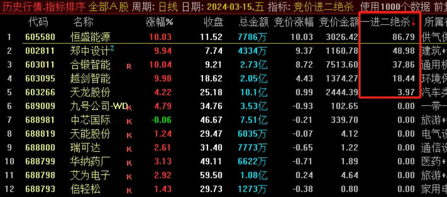 确认昨日首板之后,对首板后次日的开盘集合竞价数据进行对比,对比的数据是两个,一个是竞价换手,一个是竞昨比,指标源码可以自行修改,看效果,现在分享的指标中,“一进二绝杀”这个数据是竞价换手和竞昨比的乘积: