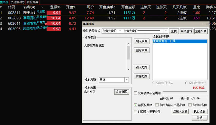 集合竞价指标——主竞龙价竞价,在进行竞价的时候,选择昨日涨停的股票即可,不必对所有A股进行选股,如果全A浪费时间,计算机运行需要时间