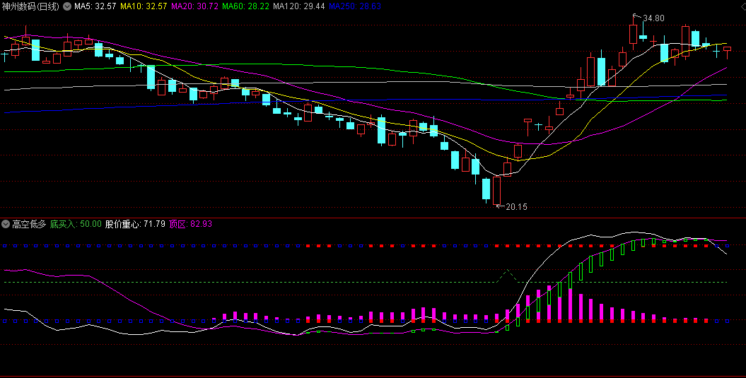5、第一次逃顶(最快):当股价重心从80以上的区域向下与80直线形成死叉,则是第一次逃顶。