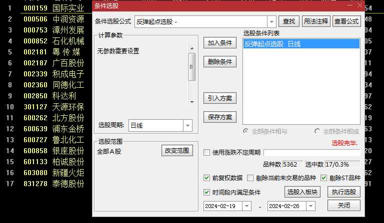 此选股指标为我网络收集得到。我做了删减整合,感觉这个选股还不错,可以用来抓反弹,值得学习研究,特此推荐给坛友。