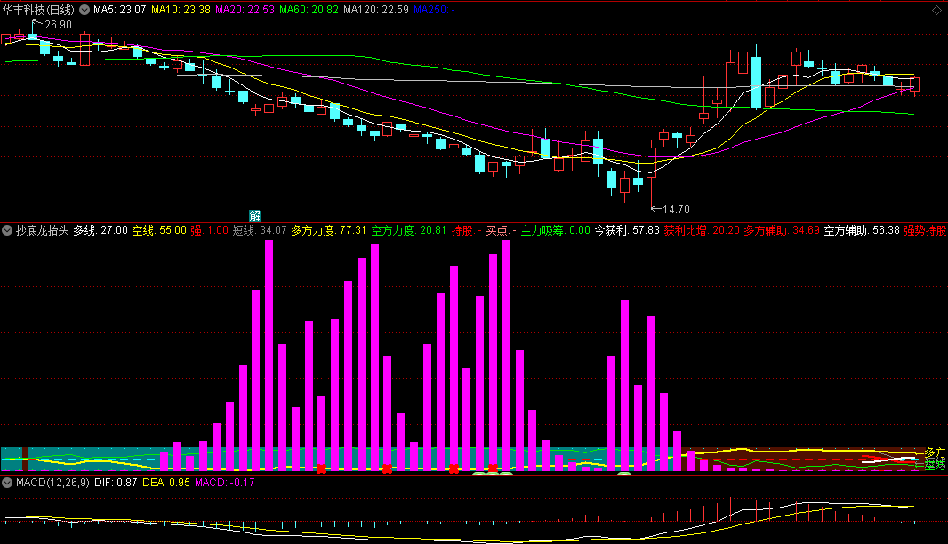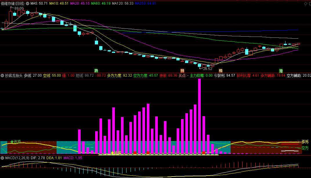 橙色多头力度增强,龙抬头,趋势向上,配合紫色柱子判断抄底点。