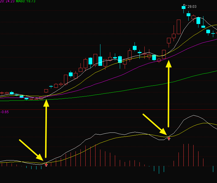 4.MACD在0轴下方——金叉属于下降趋势反弹行情,一直到上0轴才参与。