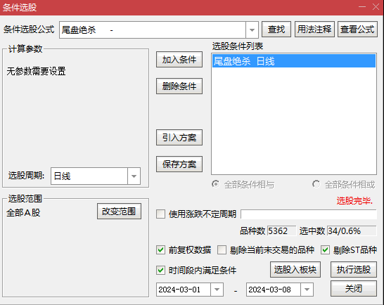 4、自动剔除问题个股:为了降低风险并确保流动性,采取了一系列筛选措施。首先,自动排除了那些存在退市风险的问题股票,如(ST、*ST)的个股。这些股票因为可能面临财务困境或其他严重问题,而存在较高的投资风险。接下来,我们对股票的流通盘进行了筛选。我们选择的股票流通盘介于50亿至100亿之间。这个范围的选择有其合理性:一方面,流通盘过大可能导致股票价格波动性小,不利于资金的快速进出;另一方面,流通盘过小则可能影响股票的流动性,不利于大资金的操作。因此,我们寻找的是一个“刚刚好”的平衡点,既能保证足够的流动性,又便于主力资金的有效运作。