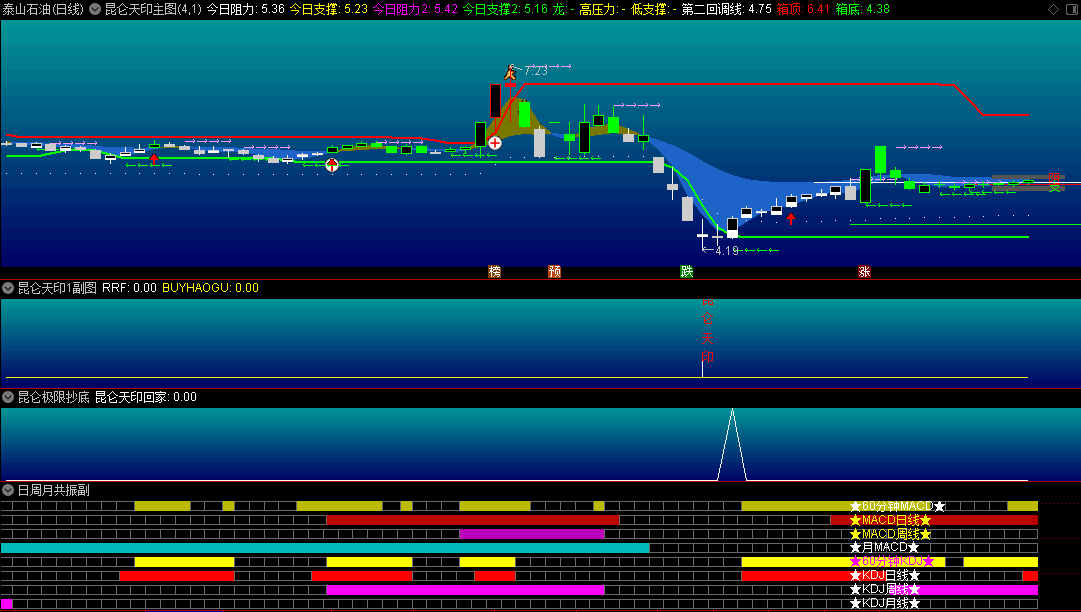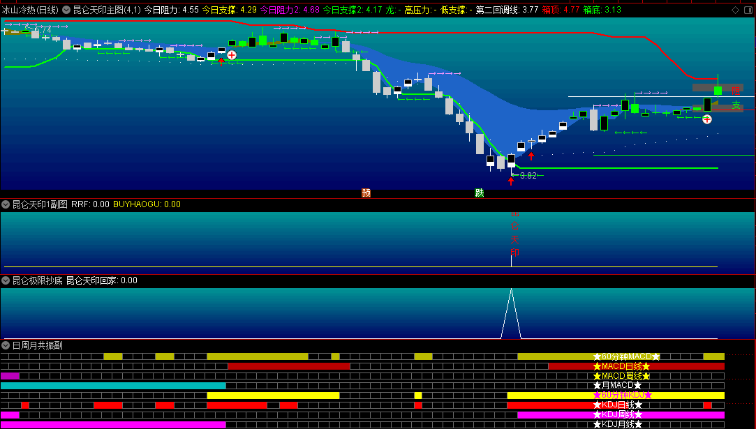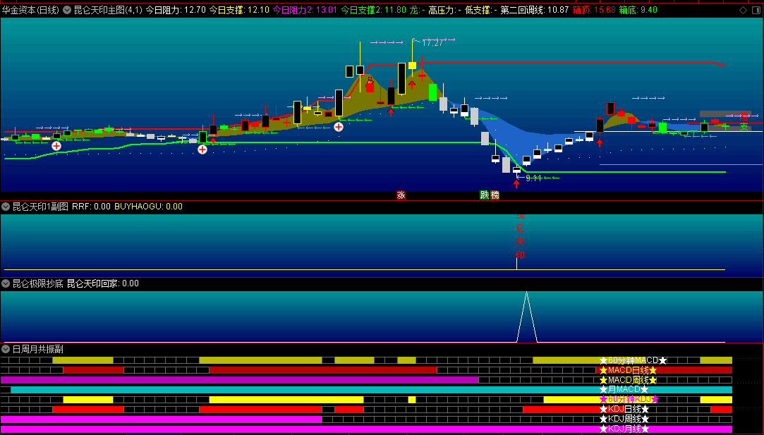 最近传得非常神的昆仑天印套装指标,除主图之外,还配送昆仑天印极限抄底、日月周共振二个副图和昆仑天印的二个选股,全部源码,不加密。