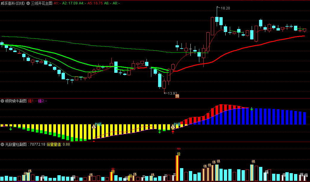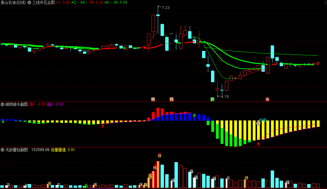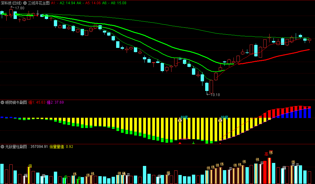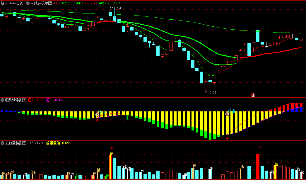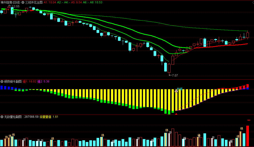 今天给大家分享的这个指标叫“寻底战法”套系指标,该指标由三个指标构成,两个副图,一个主图指标,副图分别名为“顺势骑牛”与“无敌量柱”,主图名为“三线开花”,该战法主要教大家如何寻找底部启动大牛股。有朋友经常会问,一只股票哪里是底?其实从图形来看,散户认为是底,主力抛售筹码打压,就是下跌中继!主力认为是底,带着大量的资金买进筹码,就真的是底!所以股票的涨跌,都是资金的堆砌和撤退!我们只能顺势而为,在主力拉升的时候,搭个顺风车,才能安全的获利,这就是该战法的由来,指标不含未来函数,大家放心使用,下面介绍指标使用方法: