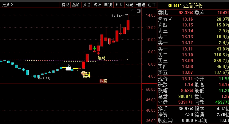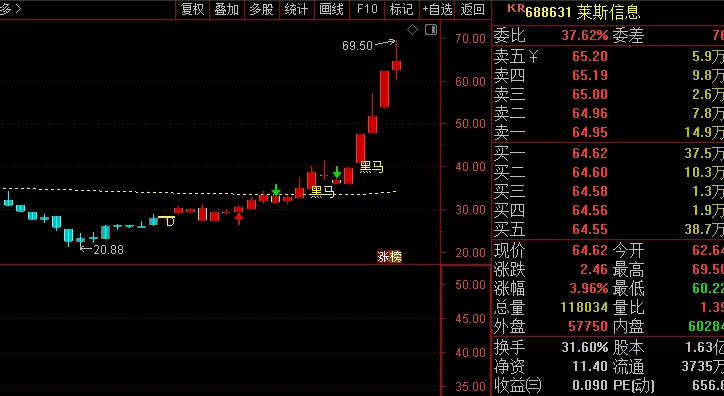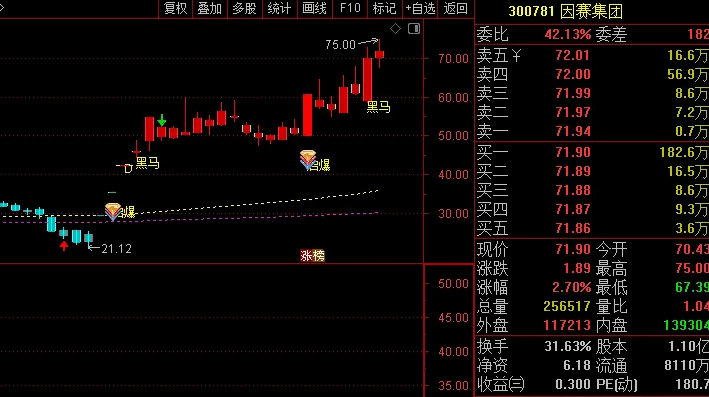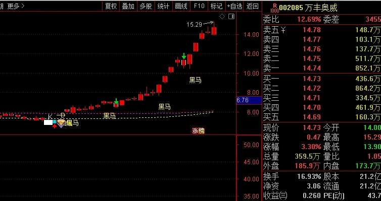 另外加上了一个黑马起爆信号,我用着感觉还行,不知道和真正的东财主图有多大差距