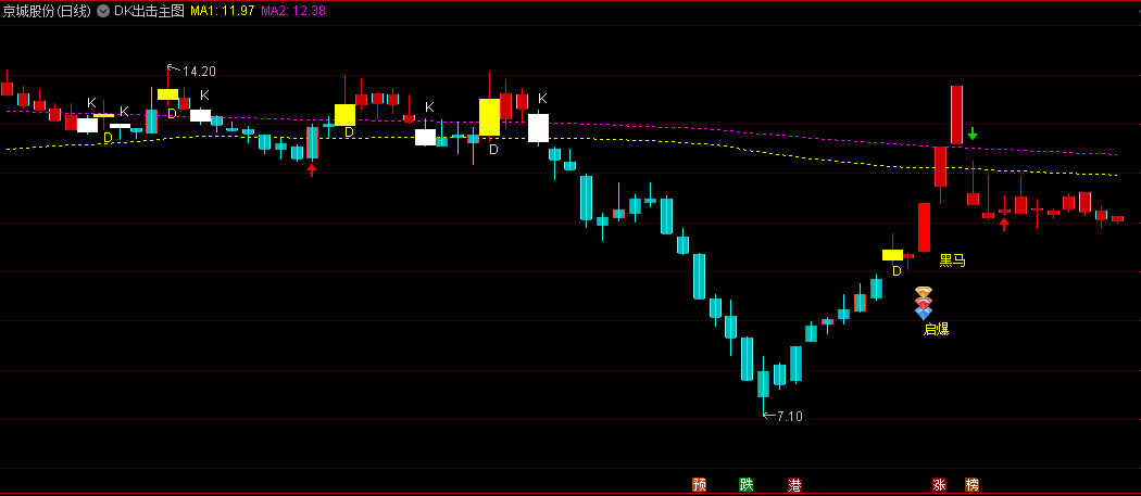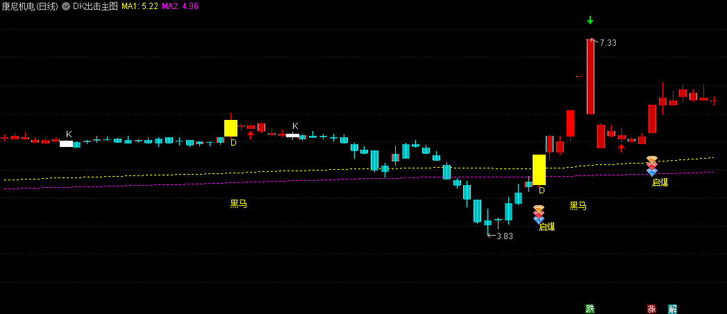 精品〖DK出击〗主图指标 仿东财主图 加上了一个黑马起爆信号 无未来 通达信 源码
