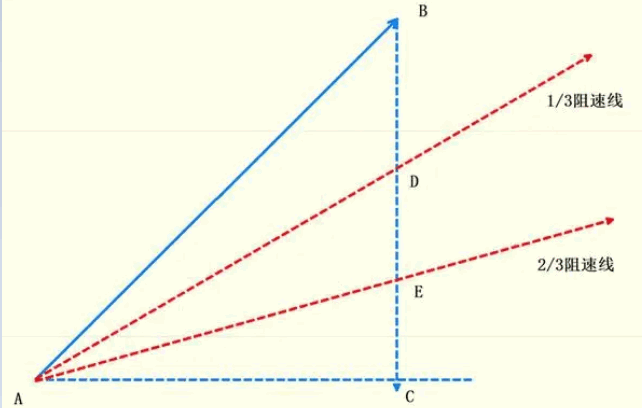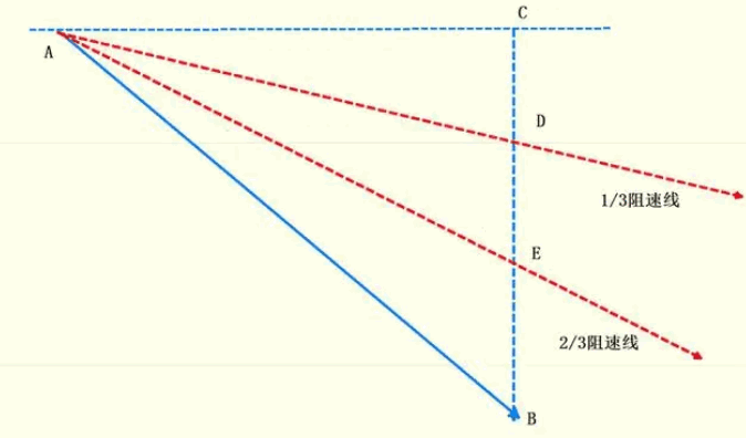 定义及基础画法:A点涨到B点,垂直高度是BC,在BC之间找三分之一点,得到D,E两个点,连接AD,AE,这两条线就是阻速线,在这个上涨型阻速线里,AD是1/3阻速线,AE是2/3阻速线。(找段黄金,沪指的图去画画)