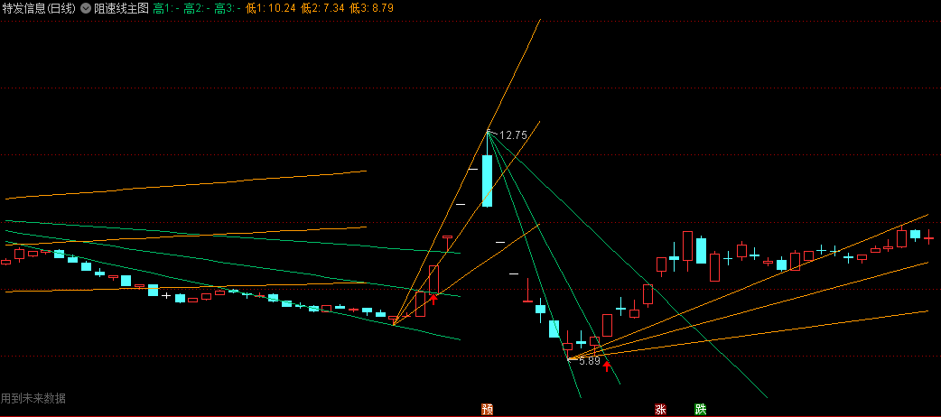 即同所有的趋势线一样,速度线一旦被突破,角色也会反串。这样,在上升趋势的调整过程中,如果上面的线(2/3线)被突破,价格则跌到1/3线,再从后者上面反弹。这时候,上面的线已演变成阻挡障碍了。仅当上面这条线被重新穿回,那么价格才可能向原高点挑战。同样的道理在下降趋势中也成立。