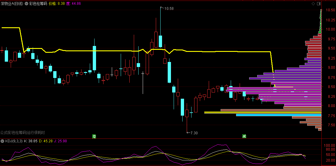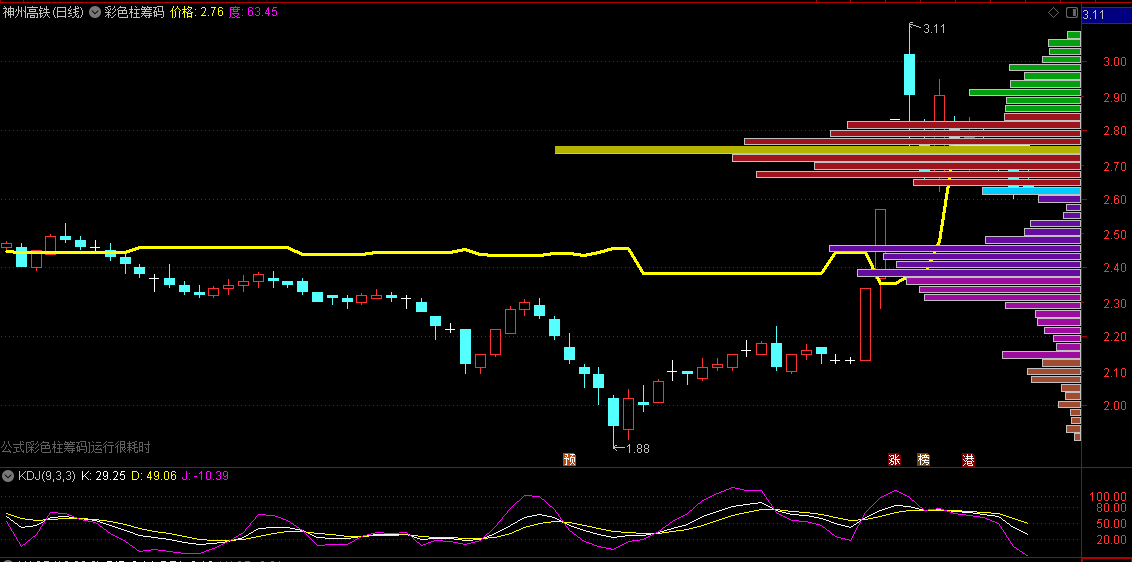 〖彩色柱筹码〗主图指标 根据筹码柱和价格线波动分析 有未来 通达信 源码