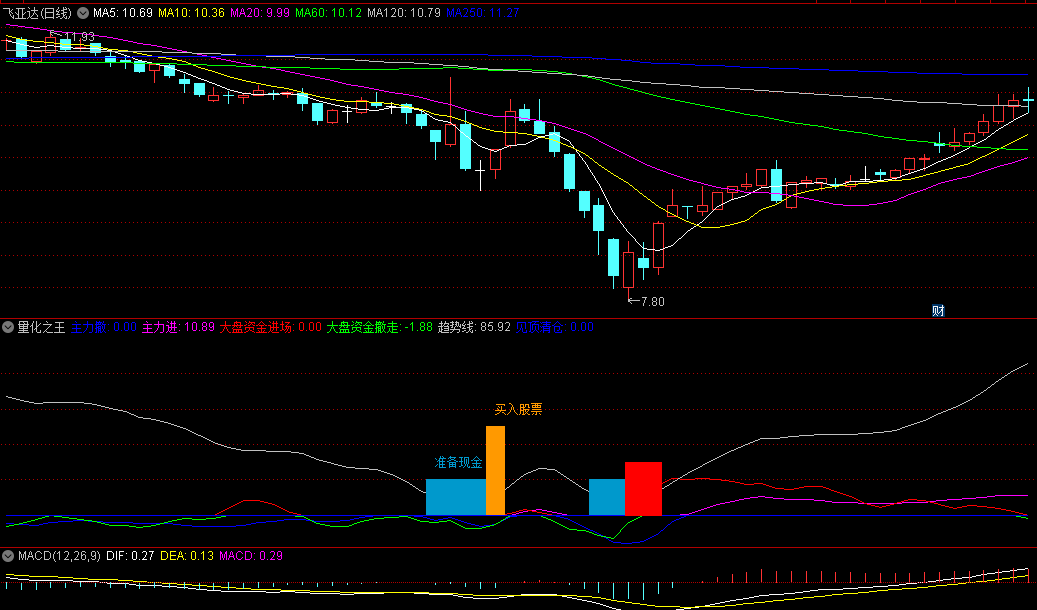 见顶清仓:当趋势线高于90且趋势线低于前一日,并且主力进指标值下降时,提示投资者可能是市场见顶,应该清仓卖出。