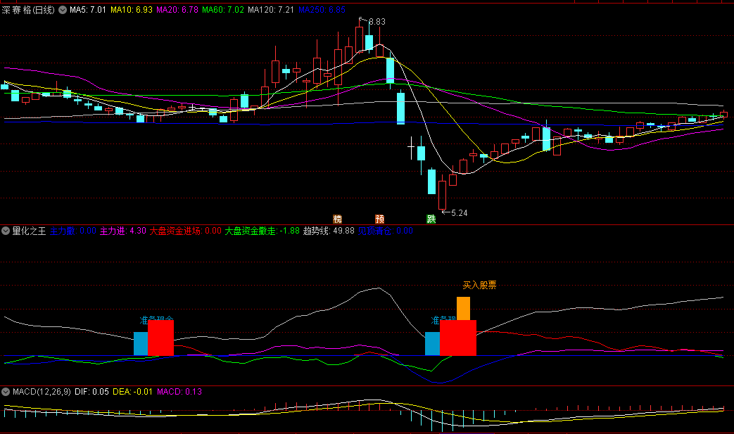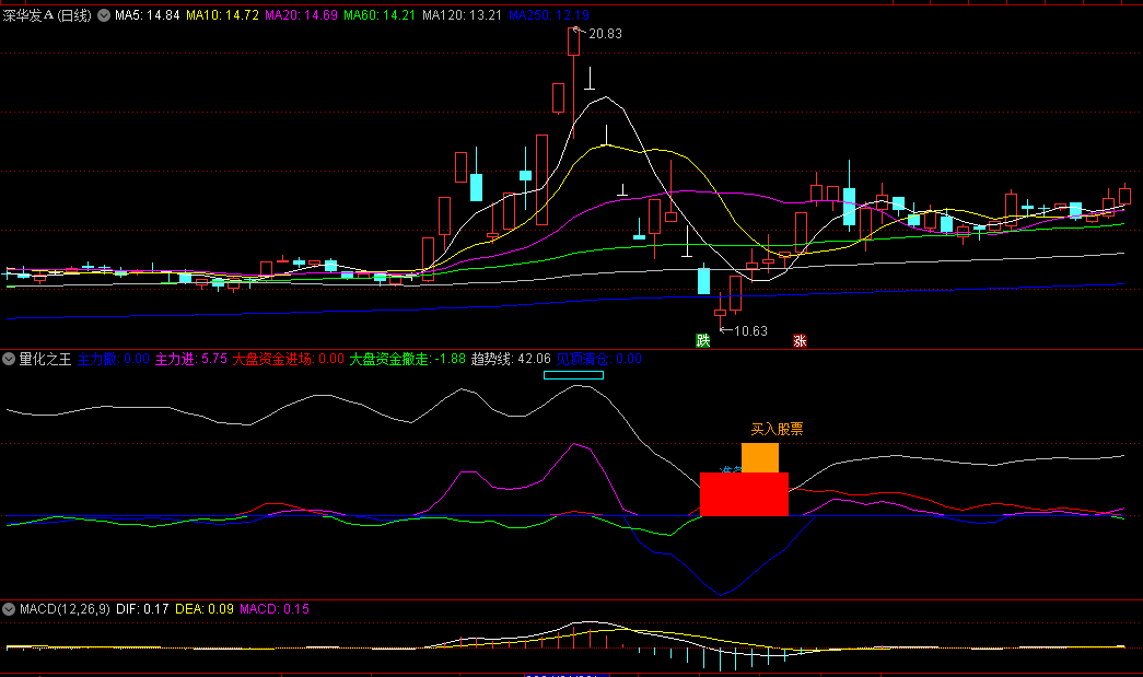 主力进:用洋红色(FF00FF)显示当主力资金进入时的指标值,表明主力可能在买入股票。