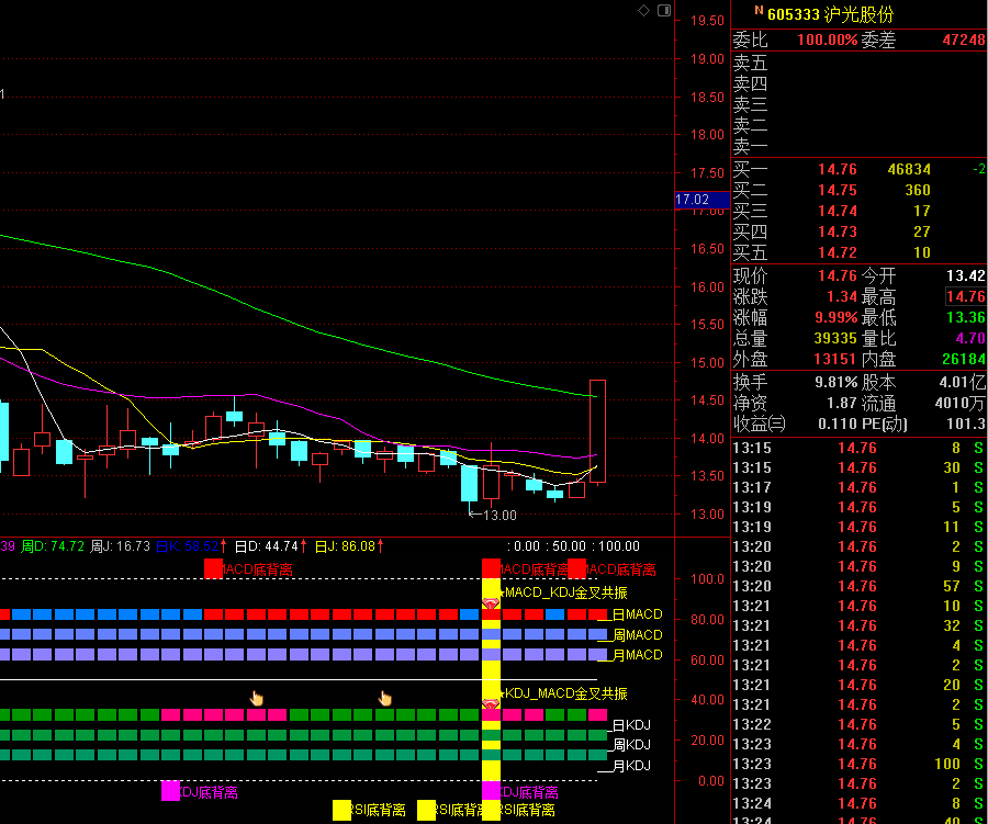 3,MACD与KDJ组合的指标共振,不适合过小或者过大的周期,例如:1分钟走势过小,MACD的趋势性优势凸显不出
