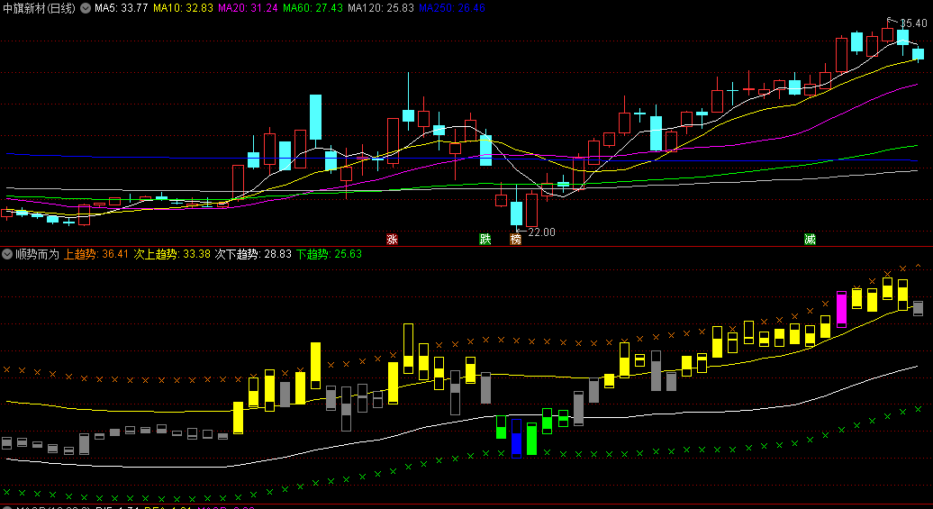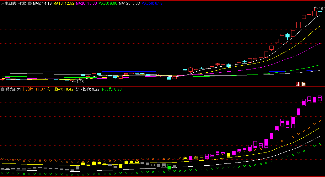 分析趋势强度的〖顺势而为〗副图指标 帮助识别价格可能走势 趋势转折点 通达信 源码