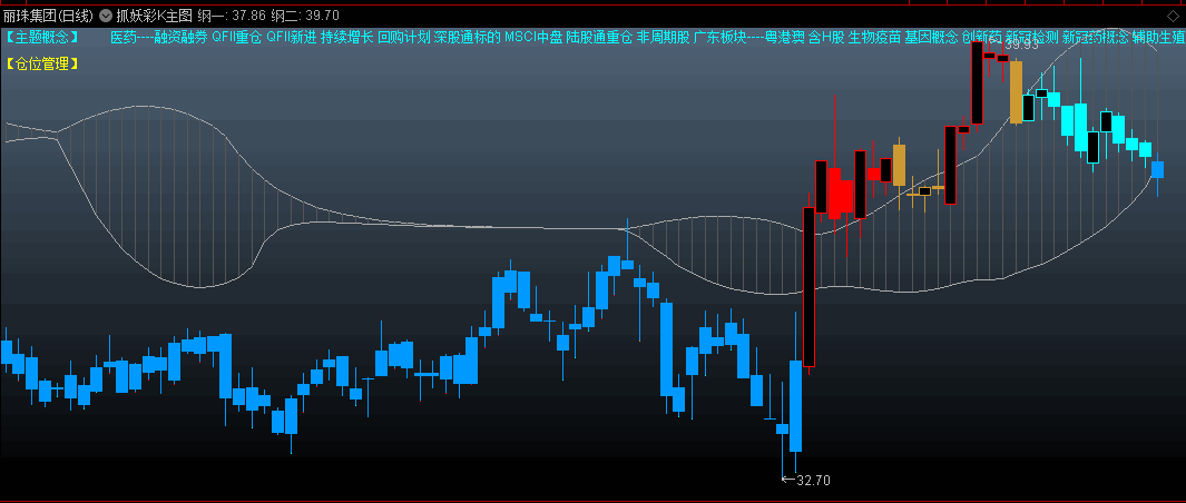 指标介绍:红色持仓,黄棕色警告,青色空仓,黄色芯涨停,蓝色芯跌停,粉上影线涨停后回落,蓝下影线跌停后回升,K线小心,蓝色忽略。
