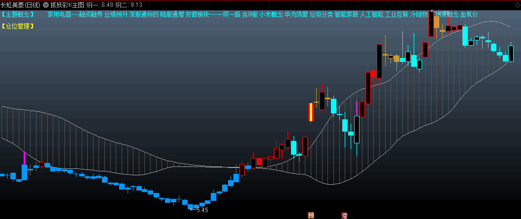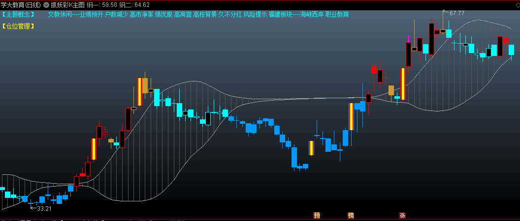 〖抓妖彩K〗主图指标 红色持仓 黄棕色警告 青色空仓 黄色芯涨停 通达信 源码